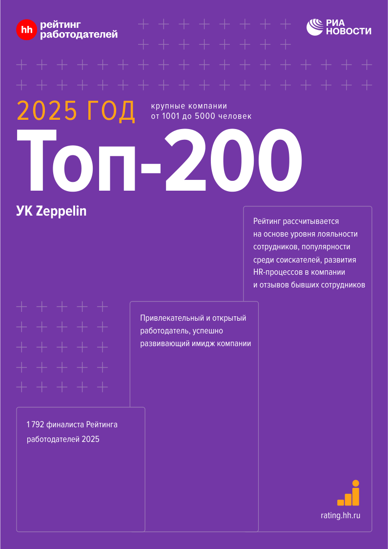 По итогам 2025 года мы снова вошли в ТОП-200 работодателей России по версии HeadHunter. Причём не впервые, Zeppelin попадает в этот рейтинг уже несколько лет подряд, начиная с 2022 года, а значит, мы движемся в правильном направлении! В компании множество людей, которые работают с нами не один год. Более 200 сотрудников остаются в Zeppelin больше пяти лет. За это время меняются задачи, проекты, роли и уровень ответственности. Кто-то приходит на одну позицию, а со временем находит себя в другой. Кто-то растёт внутри команды, кто-то становится опорой для новых коллег. И именно эта внутренняя устойчивость во многом формирует тот результат, который мы видим сегодня. Татьяна Галкина, руководитель департамента по работе с персоналом УК Zeppelin: «Когда сотрудники остаются в компании так надолго, это говорит само за себя. Значит, им здесь комфортно, их слышат и поддерживают. Мы стараемся выстраивать процессы так, чтобы у сотрудников было пространство для роста и желание расти вместе с компани