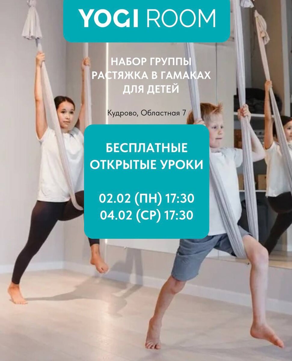 Бесплатные открытые уроки: • 02.02 (пн) 17:30 • 04.02 (ср) 17:30 Детские занятия в гамаках помогут ребенку стать сильным, сбалансированным, координированным, преодолеть барьеры и чувство страха, стать гибким и уверенным в себе 🤗 Спецпредложение в день посещения: абонемент на 10 занятий за 6500 ✨ Запишитесь на занятие: • на сайте https://yogiroom.ru/kudrovo • по телефону +79956058082 • в чате ТГ https://t.me/YOGI_ROOM_kudrovo