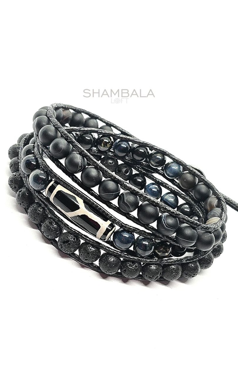Браслет-оберег для мужчины Водолея♒️ для защиты и здоровья из соколиного глаза, черного агата и лавы с Дзи Черепаха