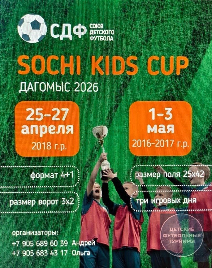 ! ⚽ Открыта регистрация на турнир «Sochi Kids Cup» 2026 🌊 🏟 СК «Дагомыс» 🔝 Категории — 2018 г.р. (25-27 апреля) и смешанная 2016-2017 г.р. (1-3 мая) 🔸 Формат — 4+1 🗓 Три игровых дня 📺 Трансляции всех матчей турнира в прямом эфире 📸 Фотоотчёт всех игровых дней 🏆 Награждение победителей, призёров, лучших игроков турнира, а также поощрение всех участников! 💰 Бонусы тренеру! ☎ Телефоны для связи: +79056896039 (Андрей) +79056834317 (Ольга) -— #ФутбольныйТурнирАпрель2026 #ФутбольныйТурнирМай2026 #ФутбольныйТурнирЮгРоссии2026 #ФутбольныйТурнирСочи2026 #ФутбольныйТурнирСочи2016гр #ФутбольныйТурнирСочи2017гр #ФутбольныйТурнирСочи2018гр Источник: https://vk.com/wall-179485997_1119