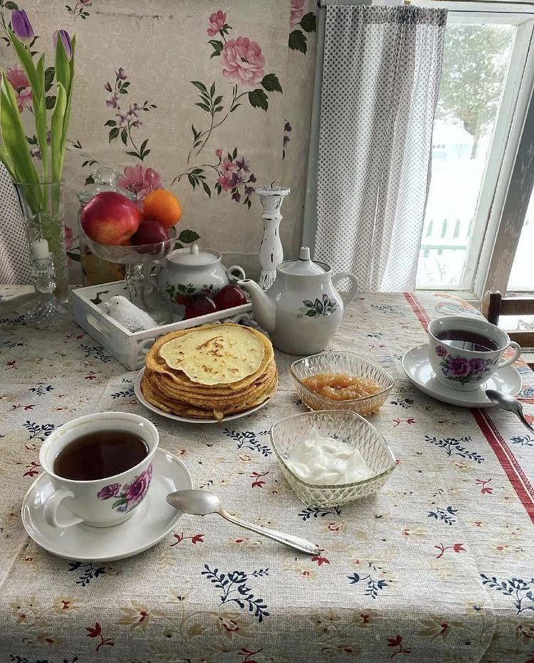 Сидим, уплетаем блины с вареньем, смотрим на сугробы. Красота, тишина.