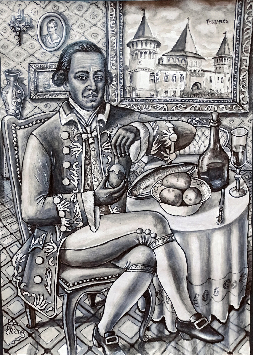 Абрам Петрович Ганнибал родился около 1696, Абиссиния( Камерун) . Скончался в своем имении в 1781, Суйда, Санкт-Петербургская губерния. Являлся сыном африканского князя — вассала турецкого султана. В 1703 году был захвачен в плен и отправлен в султанский дворец в Константинополе. В 1704 году его привезли в Москву, а через год Ганнибал был крещён. Поскольку крёстным отцом был Пётр I, в православии Ганнибал получил отчество Петрович. Абрам Петрович неотлучно находился подле царя, спал в его комнате, сопровождал во всех походах С 1756 года — главный военный инженер русской армии, в 1759 году получил чин генерал-аншефа. После смерти Петра I Абрам Петрович был в ссылке в нашем крае. В том числе в городе Тобольске. В 1762 году вышел в отставку, в своем имении Суйда Абрам Петрович культивировал картофель по просьбе Екатерины II. Есть даже сорт картофеля «Синеглазка-Ганнибал», (Ганнибала глаза были синими). «Воспоминание о Тобольске. Абрам Петрович Ганнибал» Бумага, акварель, (60х41), 2025 г