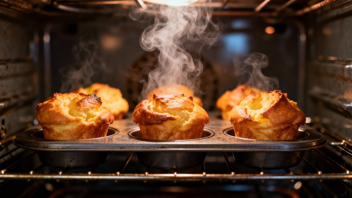 Духовку разогревают до максимальной температуры - обычно это 220 градусов. В каждое углубление формы наливают тесто, заполняя примерно две трети объема. Важно: духовку нельзя открывать в процессе выпекания, иначе булочки осядут и потеряют воздушность. Первые 20 минут поповеры пекутся при высокой температуре, затем жар убавляют до 180 градусов и оставляют еще на 20 минут. За это время булочки поднимаются, образуя характерную «шапочку».
