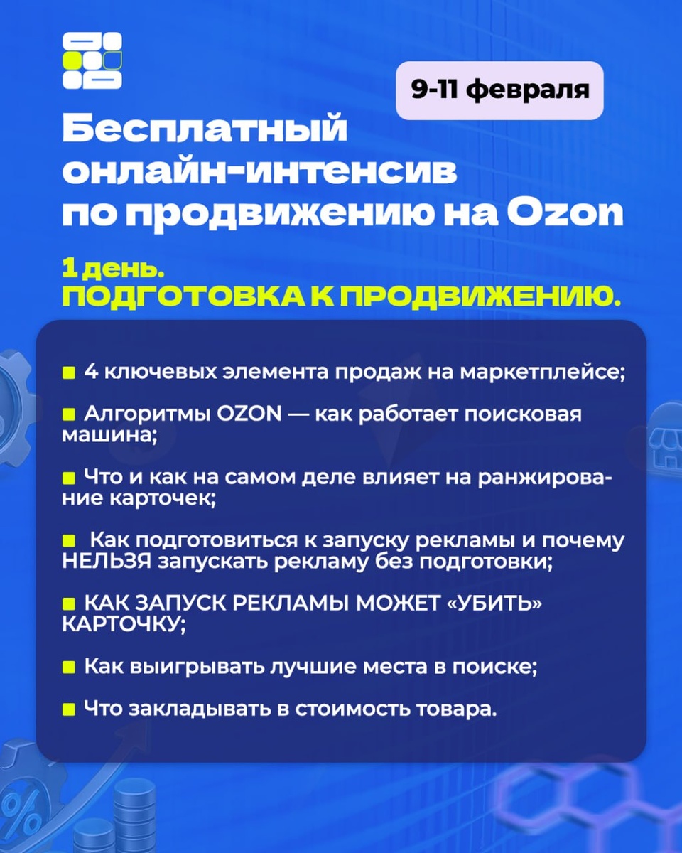? 📅 9–11 февраля мы проведем бесплатный трёхдневный онлайн-интенсив по Ozon. 1️⃣ Что нас ждет в 1 день? Разберем подготовку к продвижению — базу, без которой не стоит начинать. 🙌 Покажем, как реально работают алгоритмы Ozon, что влияет на ранжирование, почему реклама без подготовки чаще вредит, чем помогает, и что нужно заложить в цену ещё до запуска трафика. 🤩 Вся программа первого дня — на карточке. 👉 Вступайте в канал по ссылке, чтобы принять участие. Все ссылки на трансляции и подробная информация будет там.