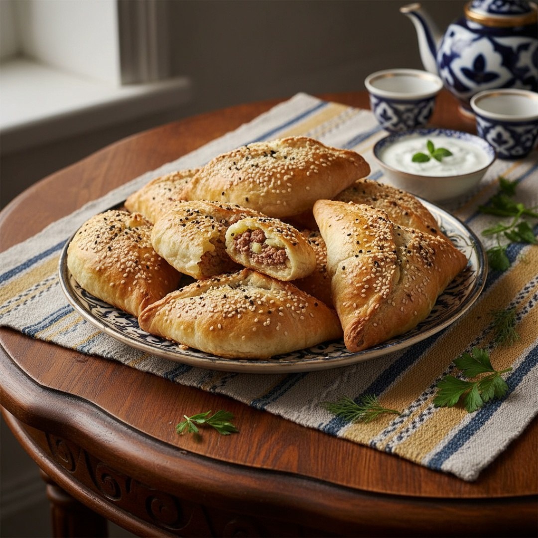 Ингредиенты⤵️ 🔸 Мука — 500 г 🔸 Вода — 250 мл 🔸 Масло растительное — 150 мл 🔸 Фарш мясной — 300 г 🔸 Картофель — 3 шт. 🔸 Лук репчатый — 2 шт. 🔸 Зира, перец, соль — 1 щепотка 🔸 Желток — 1 шт. 🔸 Кунжут — 20 г Приготовление🌯 1. Смешать воду, масло и соль. Постепенно ввести муку, замесить крутое тесто. Накрыть, оставить на 30 минут. 2. Картофель очистить, нарезать мелкими кубиками. Лук мелко нарезать. Смешать фарш, картофель, лук, специи. 3. Тесто разделить на небольшие шарики. Раскатать каждый в тонкую круглую лепёшку. 4. В центр лепёшки выложить начинку, добавить кусочек сливочного масла. Защипнуть края треугольником или конвертиком. 5. Духовку разогреть до 200°C. Противень застелить пергаментом. 6. Выложить самсу, смазать желтком, посыпать кунжутом. Выпекать 25-30 минут до румяной корочки. Рецепт дня #самса #песочная_самса #начинка #картофель #фарш_мясной #фарш_домашний #выпечка