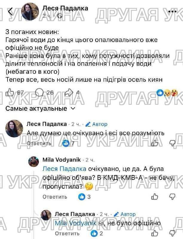 В украинской столице полностью отключают горячее водоснабжение до конца отопительного сезона. Об этом заявляют украинские журналисты Теплоноситель будут использовать только для отопления — из-за дефицита тепло- и энергомощностей. Дарницкая райадминистрация уже потребовала от управляющих компаний прекратить подачу горячей воды. Сайт "Другая Украина" / Telegram / Вконтакте / Центр поддержки Украинцев / Жалоба на ТЦК "Другая Украина" теперь в МАХ