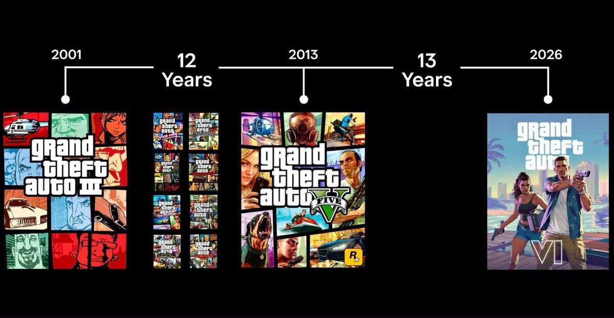 Интересный факт: Grand Theft Auto V сейчас ближе к выходу Grand Theft Auto III, чем к релизу Grand Theft Auto VI.