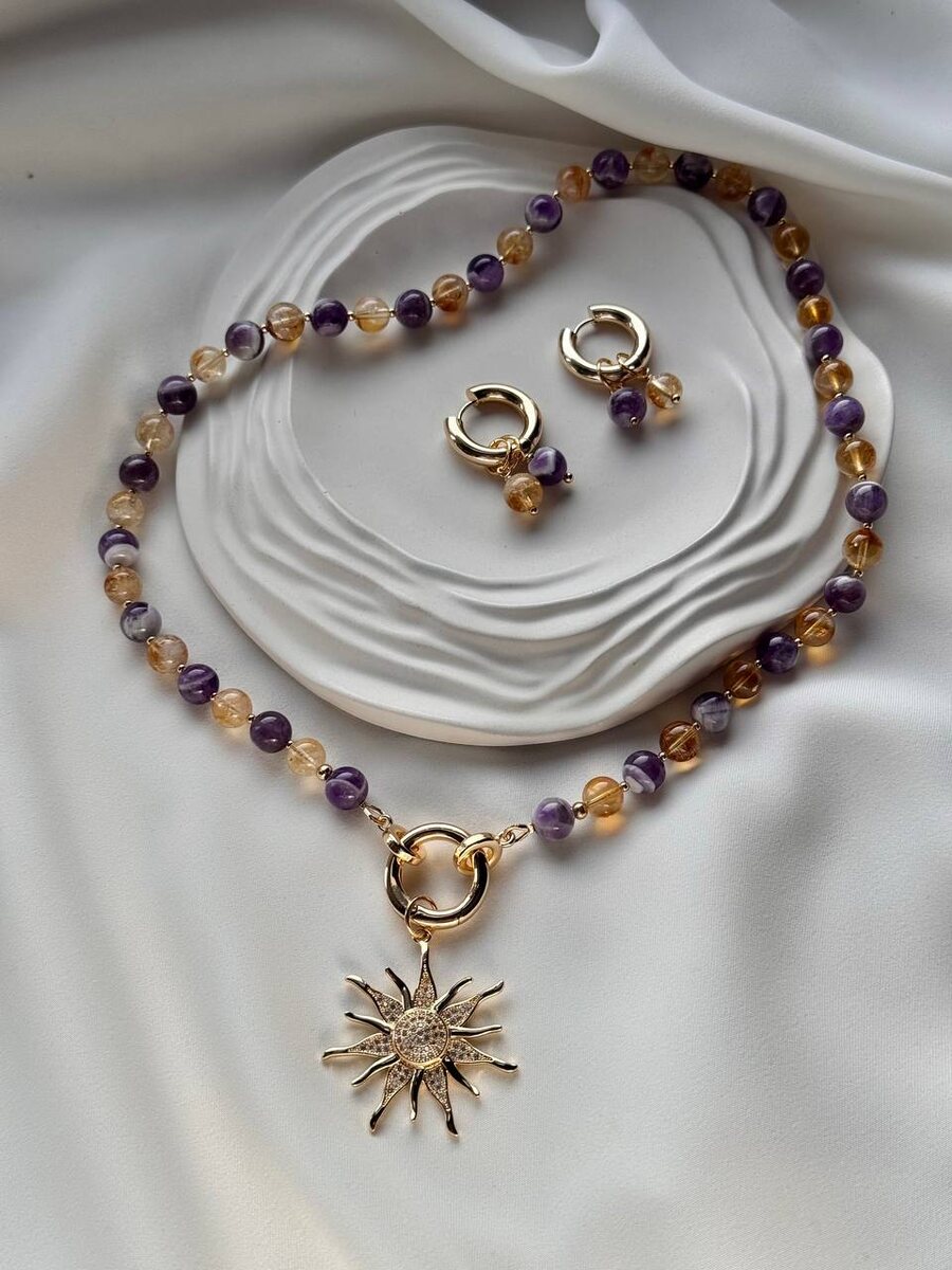 ! Колье из аметиста и цитрина 💜💛с кулоном «Солнце» – это мощная синергия, спокойного аметиста и лучезарного цитрина. Вместе они помогают материализовать желания и рассеивают сомнения, сочетая интуицию с действиями. Колье 5590₽. Серьги 2790₽. Для оформления заказа пишите в 👉🏻 @cristaria Или в WhatsApp по ссылке: https://wa.me/79220146086 Внимание‼️ Это единственный официальный номер телефона для оформления заказа👆🏻 Или оформите покупку на сайте Cristaria.ru