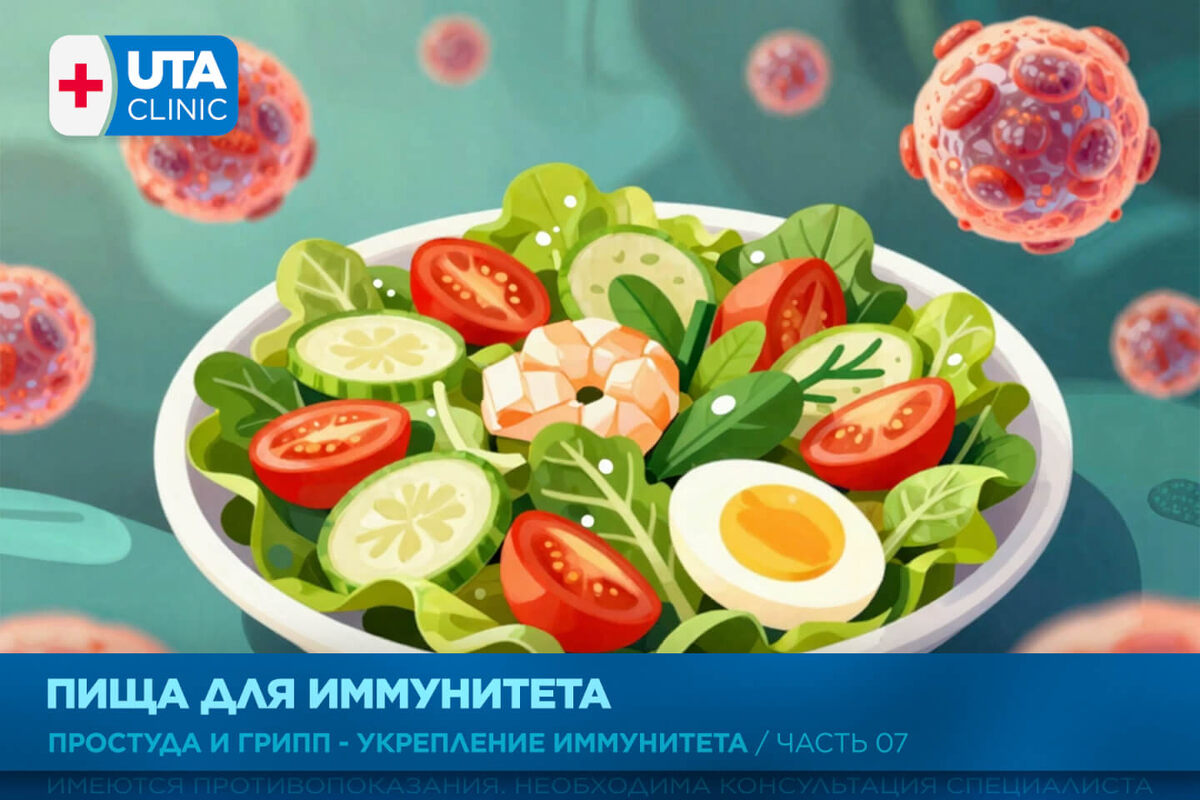 Простуда и грипп / Укрепление иммунитета. Часть 7 Иммунные клетки, как и все остальные клетки тела, нуждаются в полноценном питании. Если вы хотите иметь хорошую защиту от вирусов и бактерий, ешьте разнообразную здоровую пищу. В вашей диете должны присутствовать белки (как животные, так и растительные), жиры (животные и растительные), углеводы (простые и сложные). Все эти вещества необходимы для формирования и активности органов иммунной системы. Следите за тем, чтобы сладостей и животных жиров в рационе было меньше, чем зерновых каш, овощей, фруктов и зелени. Старайтесь есть больше продуктов, богатых витаминами. Особенно это касается витаминов С, D и В5, бета-каротина, растительных антиоксидантов, фолиевой кислоты (растительные масла и орехи, яйца и рыба, фрукты и овощи). Названные вещества участвуют в процессах формирования и функционирования защитных клеток крови, стимулируют и повышают сопротивляемость организма. Не забывайте и о минеральных веществах. Например, железо и селен (рыб