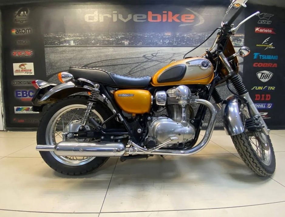 ). Двигатель: 773 см³, рядный Twin, воздушное охлаждение. КПП: 5-ступенчатая, цепной привод. Дизайн: хром, спицованные колёса, классический бак. Факты: – Вдохновлён Kawasaki W1 и британскими байками 60-х. – Пришёл на смену W650 (1999–2007) – Производство: 2011–2016, обновленная версия с 2019 года. – Выпускались версии Special Edition и café-style. Характер: спокойная управляемость, ориентирован на город и неспешную езду. В наличии в мотосалоне ДрайвБайк! KAWASAKI W800 Код товара: 3831 Год: 2011 Пробег в км: 15653 Старая цена: 621000₽ Новая цена: 469000₽ Подробнее: https://www.drivebike.ru/kawasaki-w800-3831