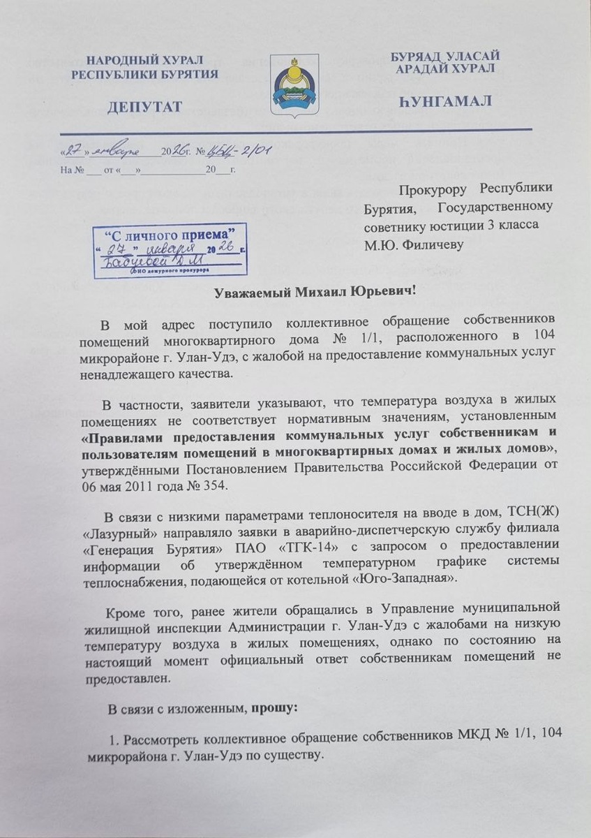 Жильцы 104-го микрорайона Улан-Удэ остались без тепла во время морозов, сообщил в своём телеграм-канале депутат Народного Хурала Бурятии Баир Цыренов (КПРФ). Он обратился в республиканскую прокуратуру. «Надо строго и чётко разобраться в причинах коммунального провала», — считает Цыренов. 📌 Тепло в Улан-Удэ поставляет ПАО «Территориальная генерирующая компания №14» (ТГК-14). В январе 2021 года контрольный пакет ТГК-14 выкупила Дальневосточная управляющая компания (АО «ДУК»). «ДУК» приобрела акции ТГК-14, взяв многомиллиардный кредит в банке, который впоследствии был выплачен за счёт займа от ТГК-14 новому владельцу. Долг был полностью погашен только летом 2024 года. Совладельцами ДУК, по данным ТГК-14, были экс-глава департамента корпоративных финансов «Российских железных дорог», бывший гендиректор ООО «Синара-Шкода» Константин Люльчев и экс-руководитель «Дирекции капитального ремонта и реконструкции объектов электрификации и электроснабжения железных дорог» РЖД Виктор Мясник. Посл