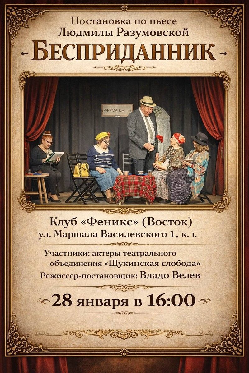 ) 📖 По пьесе Людмилы Разумовской «Бесприданник» 🎭 В исполнении актёров театрального объединения «Щукинская слобода» Зрителей ждёт ироничная и по-настоящему жизненная история, разворачивающаяся… в офисе брачного агентства 💼 👒 Четыре женщины бальзаковского возраста 🤵 И всего один жених — да ещё и бесприданник 💍 Замуж хотят все… ❓ Но кому же достанется единственный кандидат? Спектакль наполнен: ✨ тонким юмором ✨ узнаваемыми ситуациями ✨ точными психологическими наблюдениями, в которых легко узнать себя и своих знакомых 🤍 Особая ценность постановки — её исполнители. На сцену выходят артисты старшего поколения, играющие с большим мастерством, теплотой и искренностью. 📍 Адрес: ул. Маршала Василевского, д. 1, к. 1 📅 Дата: 28 января 2026 года ⏰ Время: 16:00 🎟 Вход свободный Будем рады видеть вас на спектакле! 🎭✨ #Бесприданник #ТеатрФеникс #ЩукинскаяСлобода #ТеатрДляДуши #ЛюбительскийТеатр #ТеатрСтаршегоПоколения #КультурнаяМосква #СпектакльМосква #ВходСвободный #28Января #Ид