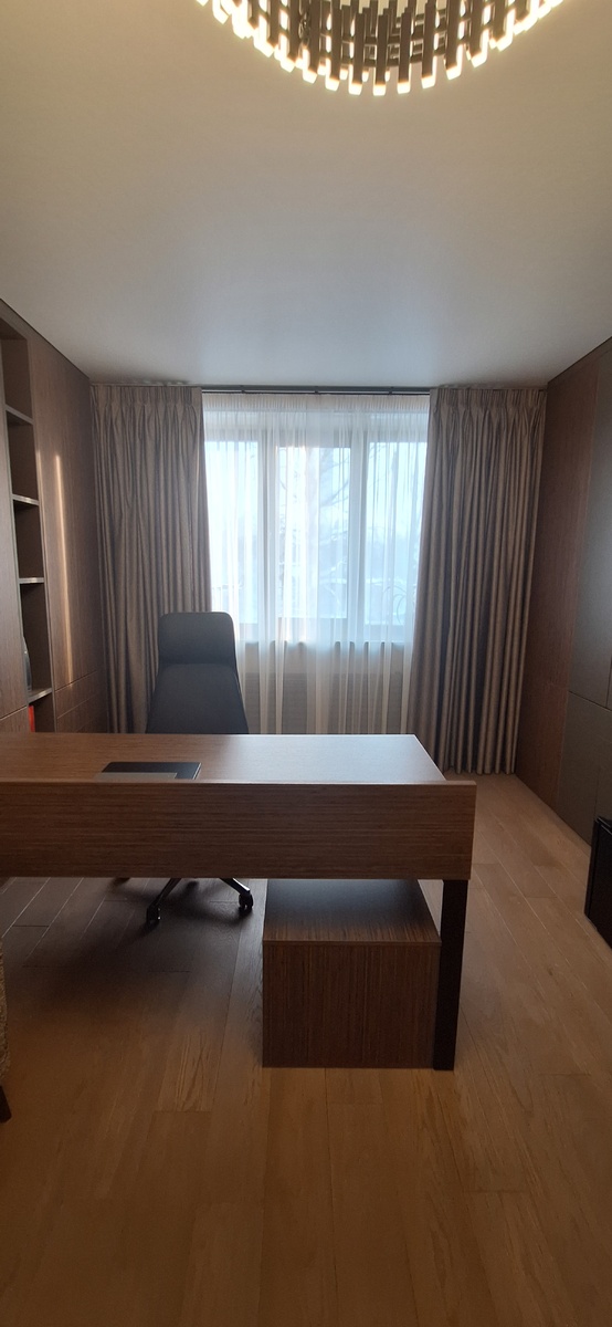 Для рабочего кабинета были выбраны шторы блэкаут в сочетании с тюлем. Плотные шторы блэкаут эффективно защищают от