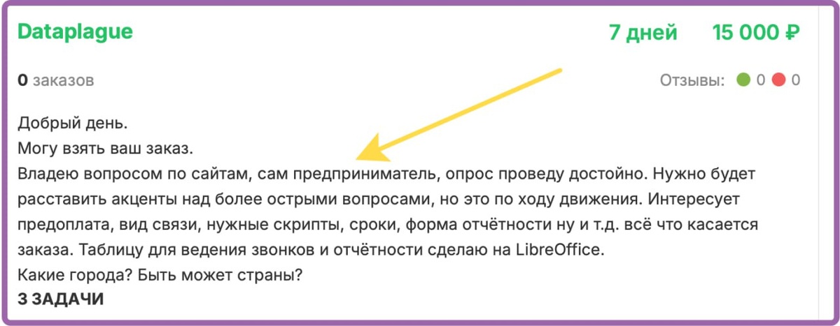 Где-то 10 звонков в день, вдумчиво. Предложить еще услуги, получить фидбек и т.п. Обычное дело. Разместил задачу на бирже, получил массу откликов но этот зацепил. Взрослый человек пишет, фотку не буду выкладывать, явно из бизнеса. Удивился я. Видимо совсем хреновато у МСБ дела идут :( p.s. человека нашли, бюджет небольшой, звонков мало. Выгодно. Русский ИТ бизнес