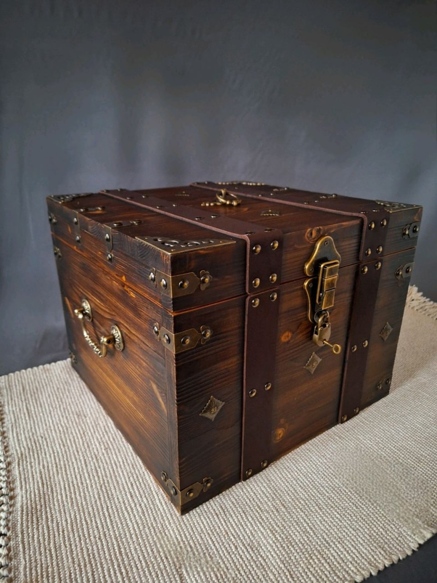 ⏳🖼📦 Короб: Сундук архивный Под старину для домашнего архива на новоселье. Это еще один вариант архивного сундука под старину для хранения документов и фотографий. Его квадратная форма (36х35х26 см) и необычный дизайн делают его практичным и особенным. В сундук легко помещаются документы и папки формата А4. Он глубокий и вместительный, но при этом не выглядит громоздко. Благородный коричневатый цвет дерева гармонирует с широкими кожанными ремнями шоколадного цвета и тускло-желтым блеском античной фурнитуры. Состаренное брашировкой дерево с рельефной структурой, покрытое винтажным воском. Сундук выглядит основательно, стильно и дорого. Запирается на накладной замок с проушиной под навесной замочек с ключом.Замочек на фото — как идея, в стоимость не входит. В моем магазине вы можете подобрать замок на свой вкус. Этот сундук подойдёт для подарка друзьям или близким по любому поводу- на День рождения, свадьбу, годовщину "деревянной свадьбы", новоселье. Или для себя любимого)) Цена: