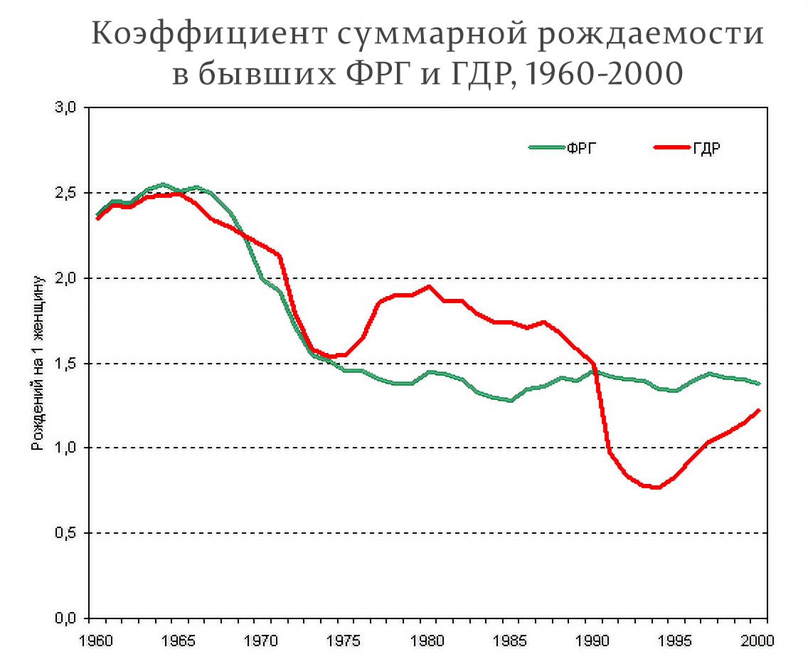 Немцы сейчас одна из самых вымирающих наций в мире. Причем, вымирать они начали едва-ли не раньше всех среди развитых стран мира: во второй половине 60-х годов прошлого века. Сразу после того, как стало сказываться демографическое эхо падения рождаемости в годы Второй мировой войны. Но затем случилось буквально демографическое чудо: со второй половины 70-х в восточной (социалистической) части Германии -- ГДР начался резкий рост рождаемости: Тогда, как в западной (капиталистической) ФРГ никакого роста рождаемости не произошло -- коэффициент фертильности (СКР) так и не поднялся выше 1,5 ребенка на женщину. А вот в ГДР СКР вырос почти 2-х детей и оставался высоким вплоть до конца 80-х годов, когда, сперва началось действие 2-го эха Второй мировой, а затем, после того, как ГДР вошла в состав ФРГ, рождаемость рухнула до неприлично низких значений (0,5 ребенка). Теперь о причинах демографического чуда ГДР. Коммунистическая партия СДПГ, осознав проблему приняла в 1971 году программу строител