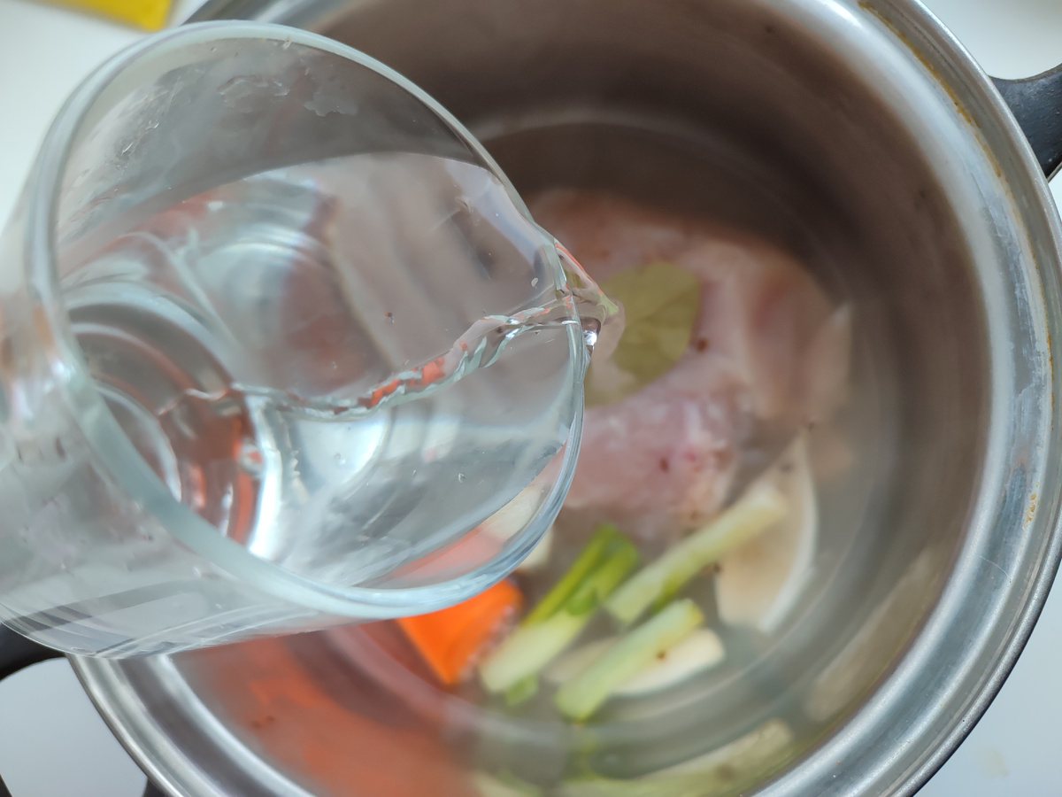 Начинаем с бульона (да, да, который многие считают диетическим). Промытую грудку зальем вместе с луковицей и морковью (их количество – на ваше усмотрение, можно по 1 шт.). Добавим сюда лавровый лист и, если есть, сушеные стебли зелени или другую зелень. Варим на среднем огне, подсолив по вкусу. Совет: как только вода закипит, снимите пену, убавьте огонь до минимума и варите под крышкой 30 минут.