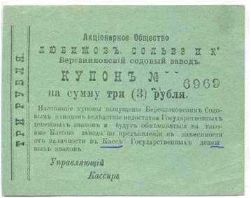 В 1869 году пермский купец-промышленник Иван Любимов откупил у казны Березниковские соляные промыслы. Контракт о строительстве в России первого содового завода был заключён 23 февраля 1881 г. в Брюсселе между Любимовым и содопромышленником Эрнестом Сольве. 21 июля 1883 г. завод был пущен в эксплуатацию, получен первый пуд кальцинированной соды. В 1887 г. Любимовым и Сольве учреждено Акционерное общество для производства соды в России «Любимов, Сольве и Ко», владевшее заводом вплоть до национализации. Бонистам хорошо известны купоны Березниковского содового завода. Они указаны во многих каталогах, например, у Кардакова (Х.7/1.1.), у Белявцева и Иванова (III.41.2.13). Даты выпуска на знаках нет, но учитывая, что уже 9 августа 1918 г. завод был национализирован, купоны могли быть выпущены до указанной даты. Ни в одном каталоге нет информации о наличии разновидностей по тексту знака. У меня в коллекции 2 знака, рассматривая их, я обратил внимание на отличие написания в тексте слова «кассѣ