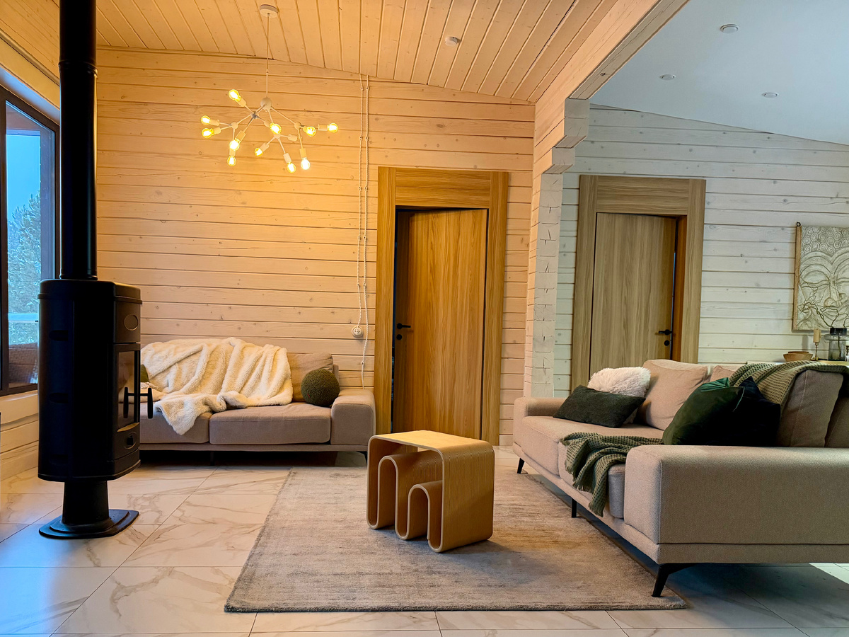 Мы заказали домокомплект из бруса в Вологде - родине корабельных сосен. Архитектор производителя адаптировал типовой проект под наши запросы - так появились большие панорамные окна и двери. На самом деле, мало что осталось от типового проекта - внутреннюю конфигурацию тоже полностью переделали 😅