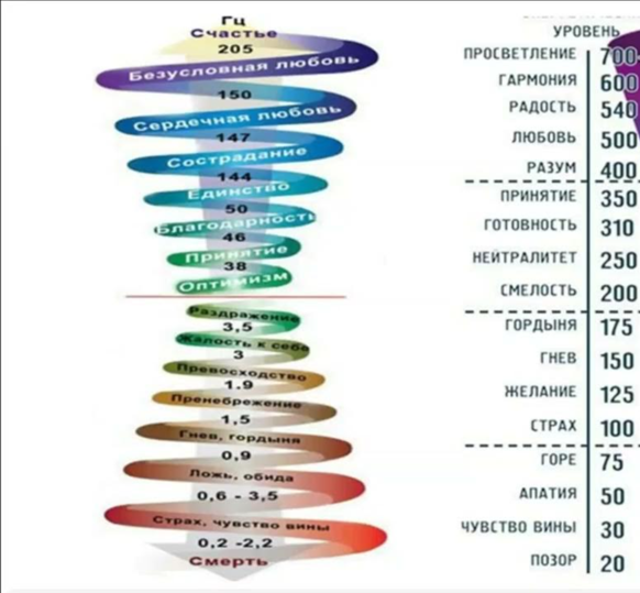 Вибрационная шкала сознания, разработанная американским психиатром, духовным исследователем и философом Дэвидом Хокинсом. dzen.ru