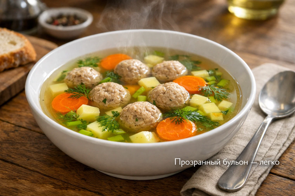 Теперь, когда мы разобрались с теорией, пора применить знания на практике. Вот проверенный рецепт супа с фрикадельками, который гарантирует прозрачный, красивый бульон и нежные, сочные мясные шарики.