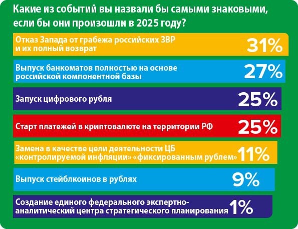 В начале января мы проводили опрос среди читателей нашего канала. Пришло время опубликовать его результаты! Какие из событий вы назвали бы самыми знаковыми, если бы они произошли в 2025 году? 🔹 Отказ Запада от грабежа российских ЗВР и их полный возврат – 31% 🔹 Выпуск банкоматов полностью на основе российской компонентной базы – 27% 🔹 Запуск цифрового рубля – 25% 🔹 Старт платежей в криптовалюте на территории РФ – 25% 🔹 Замена в качестве цели деятельности ЦБ «контролируемой инфляции» «фиксированным рублем» – 11% 🔹 Выпуск стейблкоинов в рублях – 9% 🔹 Создание единого федерального экспертно-аналитический центра стратегического планирования – 1% Итак, почти треть опрошенных (31%) считают, что отказ Запада от грабежа российских ЗВР и их полный возврат стал бы самым важным событием минувшего 2025 года – если бы, конечно, имел место. При этом 27% респондентов назвали таким важнейшим несбывшимся событием выпуск банкоматов полностью на основе российской компонентной базы. Удивительно,