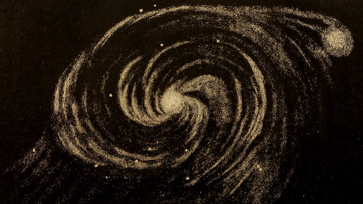 Круговорот (или колесо) — это образ вечной Диады. Спираль — образ временной Вселенной, появляющегося и растворяющегося мира становления. Спиральный, вихреобразный процесс соответствует космогонической динамике, тогда как круговращение — это форма стабильного и непрерывного движения, репрезентация двойственного Бога. © Nikoptis Иллюстрация: рисунок спиральной галактики «Водоворот», сделанный лордом Россом в 1845 году