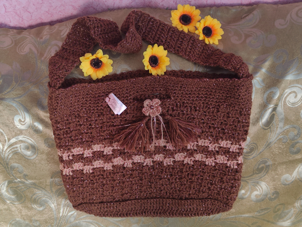 🌻По центру вязаной части сумки сделала две полоски ниточками светло-коричневого цвета.