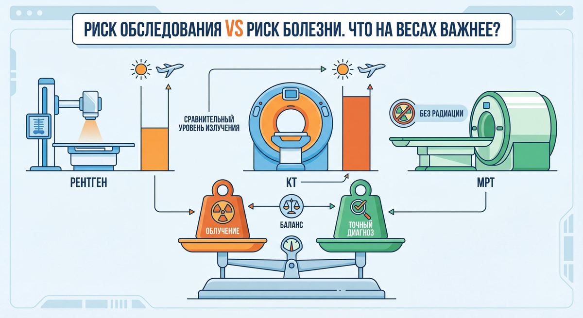 Вас когда-нибудь охватывала лёгкая тревога, когда врач выписывал направление на КТ? Или вы слышали от знакомых: «МРТ лучше, там нет радиации»? Страх перед лучевой нагрузкой - один из самых распространённых у пациентов. Он заставляет откладывать нужное обследование или, наоборот, просить «что-нибудь посильнее», не понимая сути. Пора разобраться с этим страхом на чистоту. Сегодня мы не просто перечислим риски, а сравним их с рисками, которые мы принимаем каждый день (например, загорая на солнце или летая на самолёте), и главное - сопоставим с опасностью неправильного или позднего диагноза. Давайте начнём с самого важного. Сразу расставим точки над i: МРТ (магнитно-резонансная томография) не использует ионизирующее излучение в принципе. Её работа основана на мощном магните и радиоволнах. Основные «риски» МРТ - это длительный шум, возможная клаустрофобия и абсолютные противопоказания (кардиостимуляторы, металлические осколки). С точки зрения радиации МРТ безопасна. Когда мы говорим «хуже