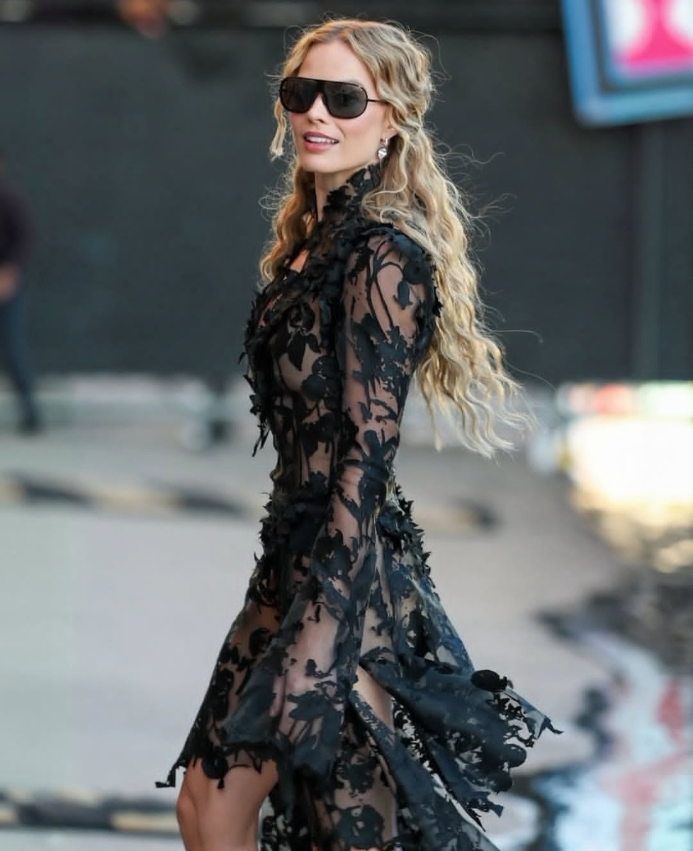 Стилист Марго Эндрю Мукамал сейчас активно внедряeт в ее образы не только подчеркнутую сексуальность, но и драматизм свойственный героини рома Эмили Бронте Кетрин Эрншо. Шоу Джимми Киммела это тот редкий случай, когда получилось очень неплохо. Для съемок Робби облачили в черное гипюровое платье с асимметричным подолом и декольте-каплей из коллекции Alexander McQueen Spring/Summer 2026, которое в сочетании с босоножками на высоком каблуке заметно скорректировали изъяны ее фигуры.
