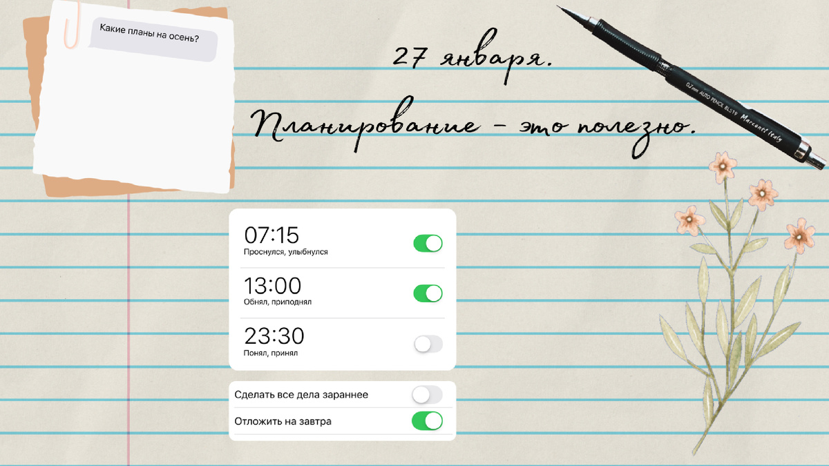 27 января. «Иногда стоит начать составлять план, и это уже вызывает трепет и предвкушение» Долгосрочное планирование не моя сильная сторона. Мой горизонт редко выходит за пределы недели. Исключением являются тренировки, которые я вношу в расписание на месяц вперёд. Это простая дисциплина: одни и те же дни, одни и те же часы. Стабильность, которая сама по себе становится опорой. А вот чувство трепета и предвкушения от планов стало в взрослой жизни редким гостем. Но я не позволяю ему исчезнуть совсем. Отпуск в новом месте - это всегда волнение и интерес. Встреча со старыми друзьями. Лёгкое, щемящее ожидание, которое тает в первые же минуты живого разговора. Или покупка чего-то важного или долгожданного. Само осознание «скоро это будет моим» заставляет сердце биться чаще. Планирование - это на самом деле здорово. Не как жёсткая клетка, а как каркас, внутри которого находится место и для спонтанности, и для неожиданностей. Сама приверженность небольшому плану - это уже форма собранности, к