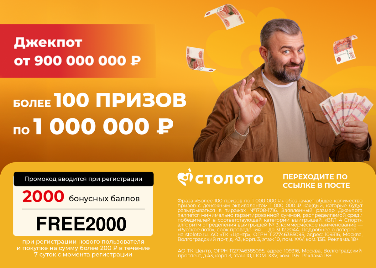 Промокод👉 FREE2000 дает 2000 бонусных баллов новым пользователям при регистрации и покупке на сумму более 200 ₽ в течение 7 суток с момента регистрации в приложении Столото.