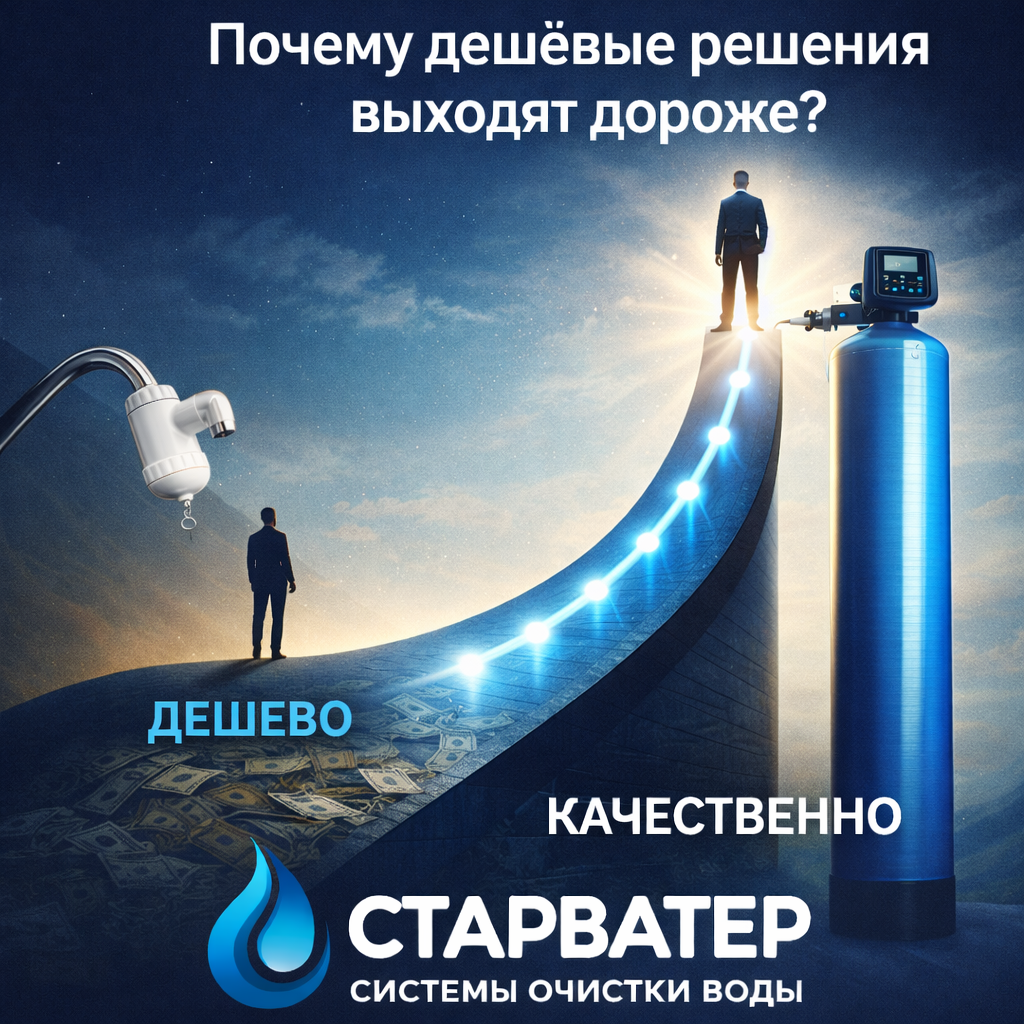 На практике — дорого. Проходит 3–6 месяцев, и появляются первые сигналы: В итоге: Дешёвые решения не решают причину, они маскируют последствия. Кувшин: Насадка: А жёсткая вода при этом продолжает: Посчитаем грубо: Через 2–3 года сумма легко превышает стоимость нормального решения, которое просто работает. Системная очистка воды: Вы платите один раз, а не каждый месяц. Дешёвое — не всегда экономное.