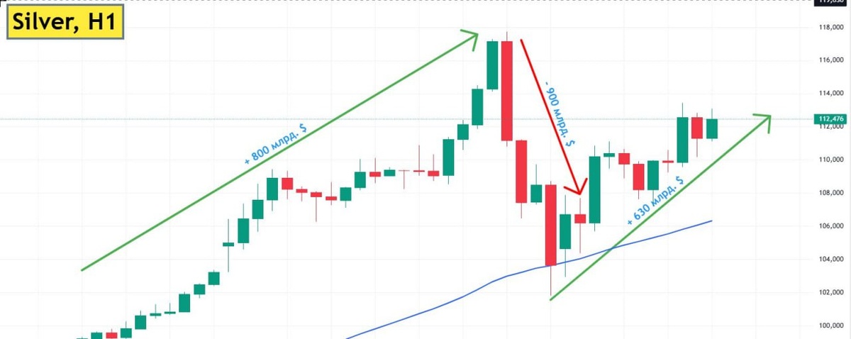 📈📉🥈Рекордная волатильность на рынке металлов. Текущая капитализация рынка серебра оценивается в 6,307 триллиона $. Это означает, что за вчерашний день капитализация серебра выросла на 800 млрд. $, а затем в течении 4-х часов упала на 900 млрд. $ и на данный момент уже вернула +630 млрд. $. ☝🏻Цифра 800 млрд. $ - это, для примера, общая капитализация топ 20 альткоинов. Т.е. за вчерашний день одно только серебро прибавило и затем стерло добрую часть крипторынка. 💡Вчерашнее падение на 13,6% за 4 часа лишь показывает, что рынок сильно перегрет и перекуплен. Любое изменение текущих процессов в мире, которое наложится на фиксацию прибыли и ликвидации маржинальных позиций может привести к коррекции, подобной тем, что мы наблюдали не раз в альткоинах.