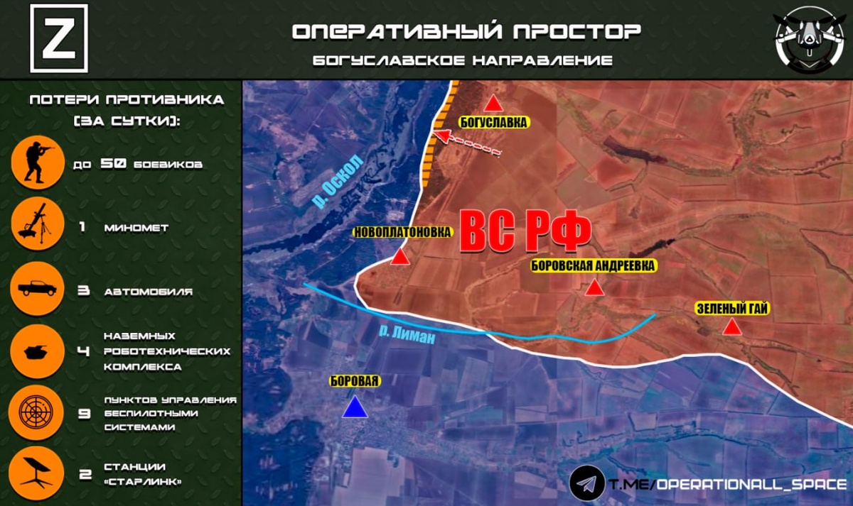 п. Богуславка. 🔻Подразделения #1_танковой_армии ГВ «Запад» активно работают по живой силе противника в лесном массиве вдоль реки Оскол. Оперативный простор Карта носит ориентировочный характер и может быть скорректирована по мере поступления новых данных.