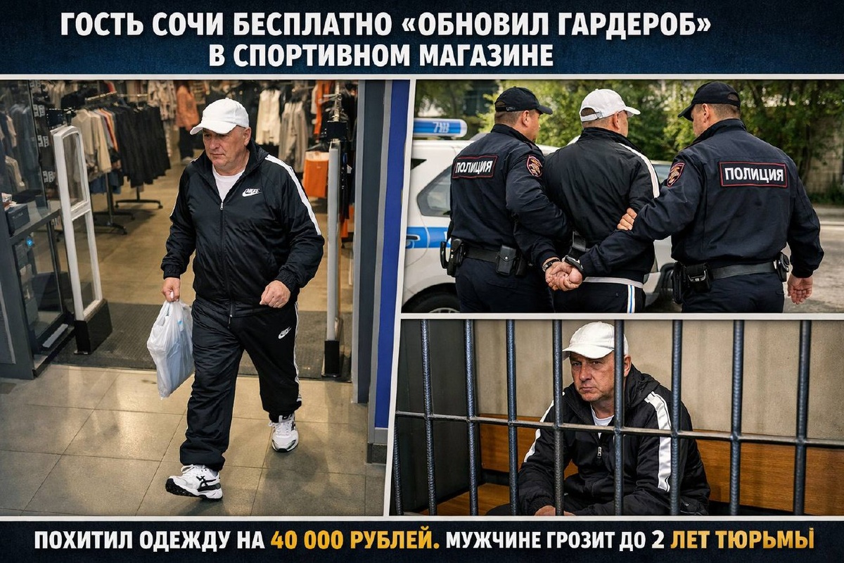 В Сочи сотрудники полиции задержали 54-летнего приезжего, подозреваемого в совершении серии краж из спортивного магазина. По данным правоохранительных органов, мужчина неоднократно посещал торговую точку, выбирал одежду, проходил в примерочную, после чего покидал магазин в новых вещах, не оплачивая товар. В результате проведённой проверки и анализа записей камер видеонаблюдения личность подозреваемого была оперативно установлена. Общая сумма причинённого ущерба составила около 40 тысяч рублей. По данному факту возбуждено уголовное дело. В соответствии с действующим законодательством мужчине может грозить наказание в виде лишения свободы сроком до двух лет. 🔥 Подписаться | Мы в MAX