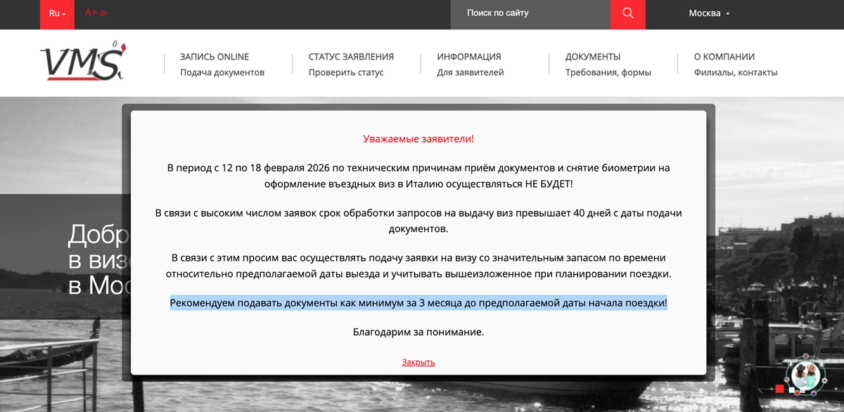 "В связи с высоким числом заявок срок обработки запросов на выдачу виз превышает 40 дней с даты подачи документов. Рекомендуем подавать документы как минимум за 3 месяца до предполагаемой даты начала поездки". На практике процесс рассмотрения заявлений на туристические и гостевые визы в Италию в Москве сейчас составляет около 60 дней, а если при подаче до поездки остаётся менее 40 дней - заявку могут не принять. С 12 по 18 февраля по техническим причинам подача запросов в консульство и ВЦ Италии в Москве и регионах будет приостановлена. "Уважаемые заявители, доводим до вашего сведения, что с 12 по 18 февраля 2026 включительно, по техническим причинам подача запросов на визы будет временно приостановлена как в авторизованных визовых центрах, так и непосредственно в Генеральном консульстве Италии в Москве", - говорится в обращении консульства страны. В визовых центрах Италии, которые относятся к юрисдикции петербургского консульства (Архангельск и Санкт-Петербург) ограничений на приём не