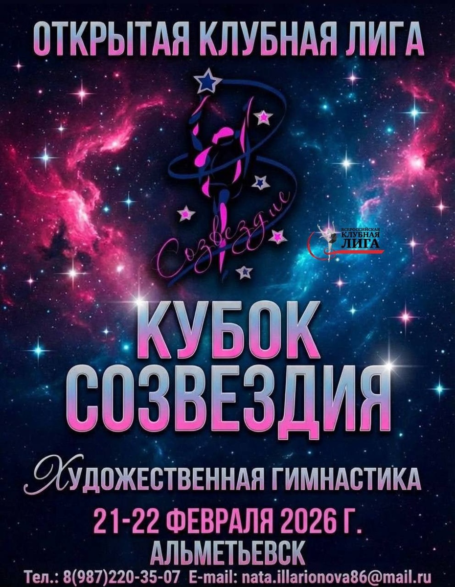 »🌟 21–22 февраля 2026 года в Альметьевске (Республика Татарстан) состоятся соревнования Открытой Клубной Лиги по художественной гимнастике — «Кубок Созвездия». Этот турнир станет важной соревновательной точкой сезона для гимнасток клубной системы. 📈По итогам выступлений всем гимнасткам начисляются рейтинговые очки Клубной Лиги, которые учитываются в общем рейтинге сезона. 👤Руководство соревнований: • Главный судья — Гордеева Мария Эдуардовна • Директор турнира — Илларионова Наталья Евгеньевна Соревнования пройдут в рабочей, соревновательной атмосфере и станут возможностью подтвердить уровень подготовки и укрепить позиции в рейтинге. 👉Подробности и положение — на сайте: https://rgclubsleague.com/schedule/otkrytaya-klubnaya-liga-quot-kubok-sozvezdiya-quot6079_96487/