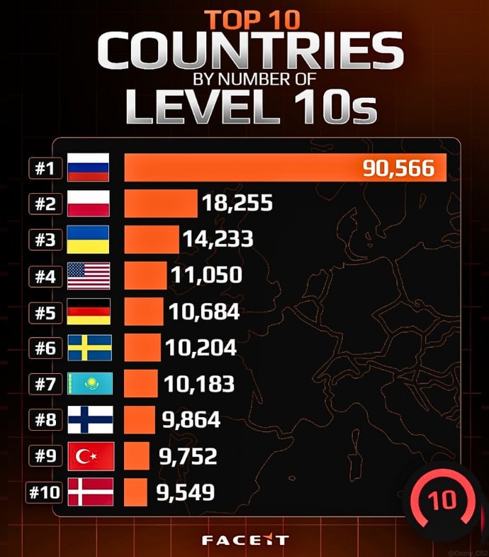FACEIT раскрыли ТОП-10 стран с наибольшим количеством игроков 10 уровня