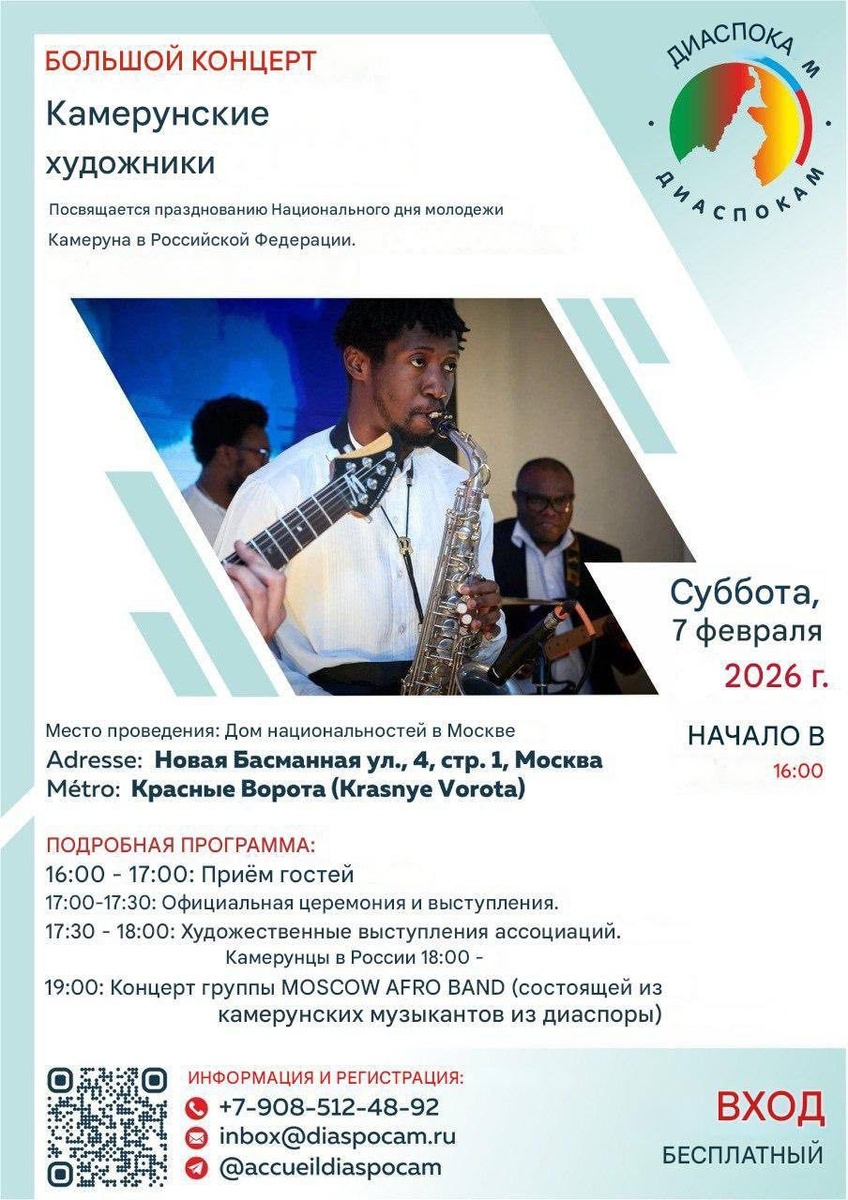 Концерт камерунских артистов Торжественное мероприятие, приуроченное к 5-му ежегодному конгрессу камерунской диаспоры в России. Программа: поздравления от официальных лиц, выступления камерунских артистов и афробэнда (кавер-группа в основном составе из камерунских музыкантов). Дата и время: Суббота, 7 февраля 2026 г., начало в 16:00. Место: Москва, ул. Новая Басманная, д. 4, стр. 1 (метро «Красные ворота»). 🌍 2. Фестиваль африканской культуры «ОКНО В АФРИКУ» Большой праздник, где можно погрузиться в атмосферу континента. Дата и время: Воскресенье, 8 февраля 2026 г., с 14:00 до 19:00. О фестивале: Узнать подробности и программу можно на сайте: https://windowtoafrica.ru/ ⚠️ Количество мест на концерте ограничено, поэтому просим подтвердить ваше участие. Пожалуйста, зарегистрируйтесь на интересующие вас события по ссылкам ниже: Регистрация на концерт 7 февраля: https://forms.yandex.ru/u/693a6cf4f47e73d3a7da335b Регистрация на фестиваль 8 февраля: https://forms.yandex.ru/u/6935e