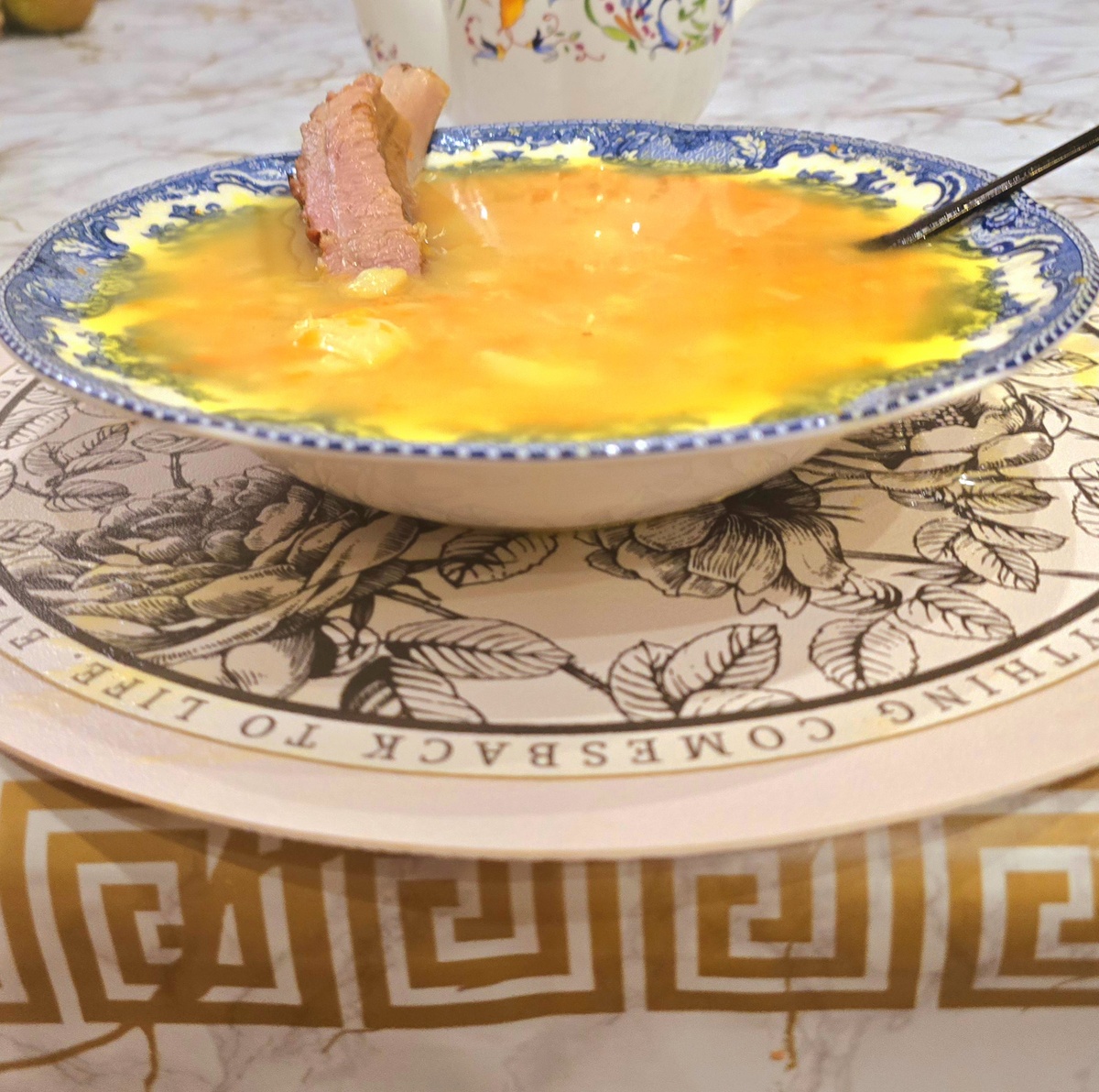Ароматнай гороховый суп с копчеными ребрышками. Зимой все хотят основательной, согревающей, горячей еды. Гороховый суп один из самых популярных в Русской кухне, входит в Топ 10 супов Россиян. У кого нет нет рецепта, делюсь: Копчёные свиные рёбрышки Рублевский — 500 - 1 кг Картофель — 4-5 средних. Морковь — 1 крупная Лук репчатый — 1 крупная луковица Чеснок — 2–3 зубчика Лавровый лист — 2 шт. Перец чёрный горошком — 5–6 шт. Вода или куриный бульон — 4-5 литров Горох Мистраль - три чашки по 400 мл. Соль, черный перец — по вкусу Укроп, чеснок. Горох промойте под краном и замочите в холодной воде на ночь, можно на час , но варится будет дольше. Разделите свиные рёбрышки на сегменты. В большую кастрюлю налейте воду или куриный бульон. (Я варю на бульоне, но это не обязательно, он и на воде будет вкусным за счет ребер и зажарки. Если на воде ребер 1 кг , если на бульоне , то ребер 500 гр.) Выложите туда рёбрышки. Доведите до кипения, снимите пену и варите на медленном огне 30 ми