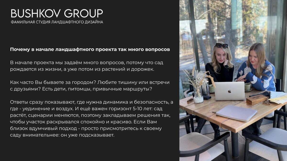 На старте ландшафтного проекта заказчики часто удивляются количеству вопросов. Кажется, что часть из них не имеет прямого отношения к растениям, дорожкам или благоустройству. Но именно этот этап закладывает основу будущего сада и определяет его качество на годы вперёд. Профессиональный ландшафтный дизайн начинается не с посадочной ведомости и не с красивой картинки. Он начинается с диалога. В BUSHKOV GROUP мы воспринимаем проектирование сада как совместную работу с заказчиком. Чтобы создать пространство для жизни, нужно сначала понять, как эта жизнь устроена. Первая группа вопросов почти всегда про быт и привычки.
