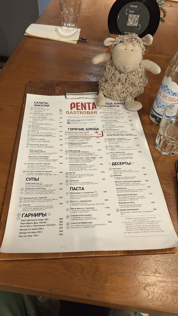 Отдохнув в удобной кровати пару-тройку часов, Овца Борис стал морально готовиться к ужину. В Penta гастро-баре на 3м этаже довольно большое и разнообразное меню, как и положено в приличном отеле. Долго думать не пришлось, решили устроить русский ужин. Ну, а что? Зима на дворе ❄️❄️❄️ - Оливье с ростбифом и красной икрой (750 руб.) - Традиционный борщ со сметаной и зеленью (590 руб.) - Пельмени из говядины (750 руб.) Цены умеренные, вкус - соответствует ценнику, приятная атмосфера и много симпатичной молодежи 😉 #penta