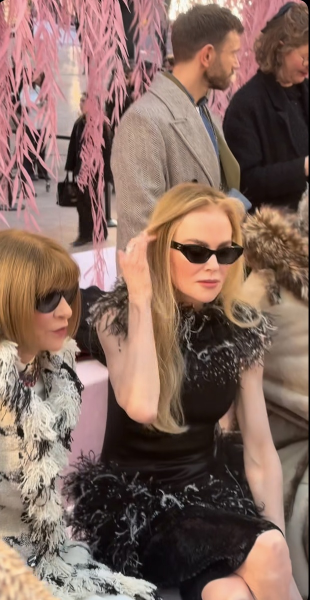 Как и полагается, в обновках от Дома. В этот раз на ней немало бахромы и выглядит это свежо. Рядом что-то горячо обсуждает Николь Кидман.На ней платье