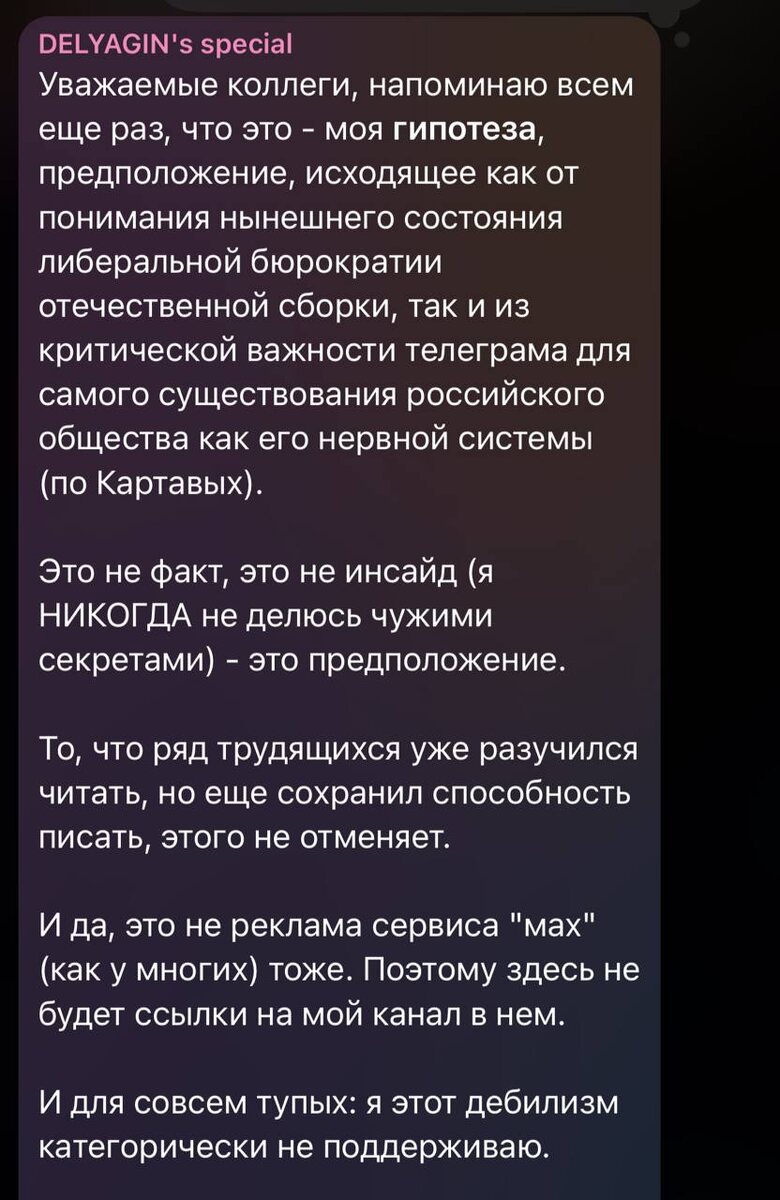 Блокировка Телеграма — это всего лишь гипотеза депутата Делягина: парламентарий внезапно опубликовал пост, где подробно всё опроверг. Это не факт, это не инсайд (я НИКОГДА не делюсь чужими секретами) - это предположение. Отмена тряски. CtrlAltDelights- подписаться