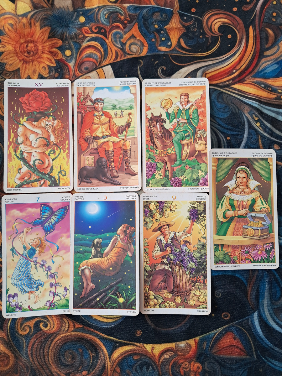 · Ситуация: К вам придут многочисленные предложения, идеи, возможности (7 Кубков), особенно в сфере творчества, проектов или сотрудничества. Однако не все они будут осуществимы. Ключ — в третьей карте, 9 Пентаклей — это карта личного материального и эмоционального благополучия, достигнутого своим трудом.