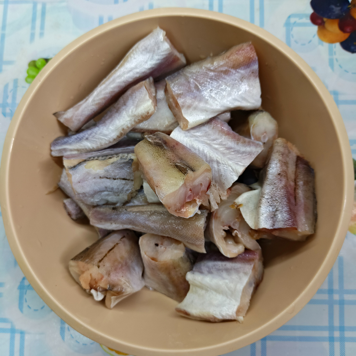 Чистим и тщательно промываем рыбу, убираем черную плёнку и нарезаем на кусочки.