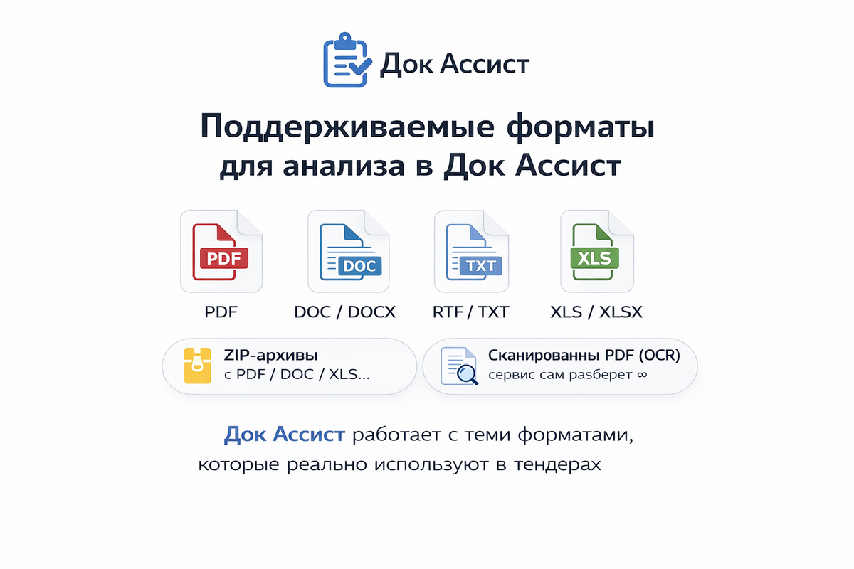 При работе с тендерами участники сталкиваются с документацией в самых разных форматах. Заказчики размещают файлы в PDF, Word, Excel или загружают архивы с несколькими типами документов. Поэтому сервис для анализа тендерной документации должен уметь работать с реальными форматами, а не требовать предварительной подготовки файлов. Док Ассист создан именно под эти задачи. Сервис принимает и анализирует основные форматы тендерной документации: Также поддерживается загрузка ZIP архивов, внутри которых могут находиться PDF, Word и Excel файлы. Док Ассист автоматически извлекает документы и запускает анализ без участия пользователя. В тендерах часто встречаются сканированные PDF документы, где текст представлен в виде изображений.