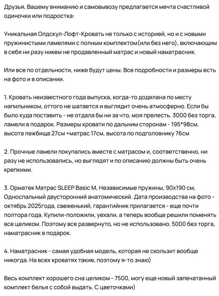? Я так давно ничего не продавала, что с новой формой разбиралась полчаса, а потом еще полчаса ваяла сие чудо прозаической мысли. А авито нынче, оказывается, не разрешает даже назвать объявление поинтересней, а сам выдает скучное-нудное "Кровать" и размер, что аж открывать не хочется, дабы прочесть мой ворох пассажей и загореться идеей "вотэтоточнохочу"! И при этом в объявлении есть одна большая правда. Это Моя Прелесть и она мне реально очень нравится) Но я нашла где добыть мою металлическую мечту, так что место надо)