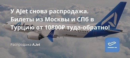✈️🇹🇷У турецкой авиакомпании AJet снова распродажа. Из Москвы и СПб можно слетать в Турцию от 10800₽ туда-обратно. Можно с захватом 23 февраля, 8 марта.